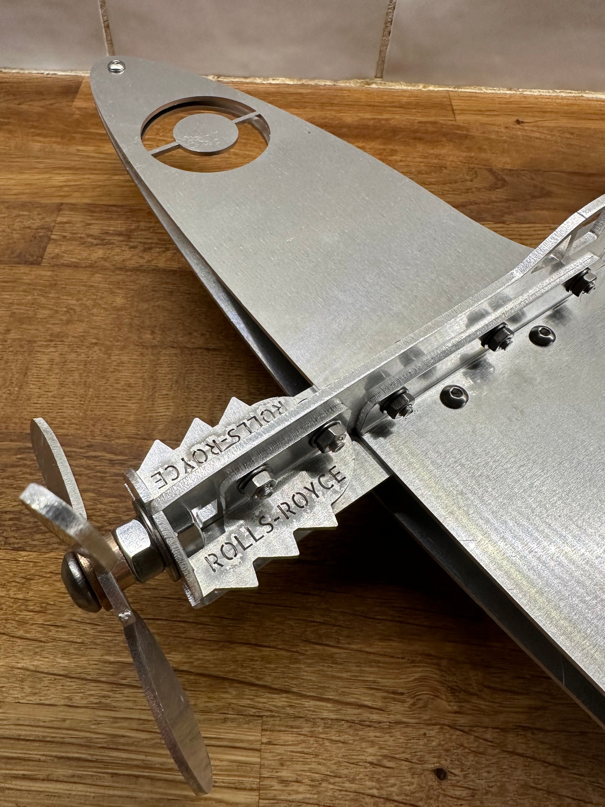 Designed and made in the UK, this Spitfire model is laser-cut from 2-3mm aluminium and is provided with A2 stainless steel fixings. The propeller is fitted with an Olite brass bearing which allows it to rotate in the wind, and the plane can be positioned as wanted thanks to the swivel and pivot mounting built into the wall bracket.